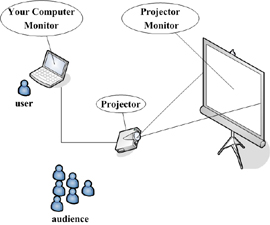 When you work with computer and projector, Presentation Aide will greatly help you. The projector monitor can mirror your computer monitor synchronously, except something such as Presentation paper window and a Memorandum window. So, you can read something prepared in your computer monitor, but audience can not see them in the projector monitor!
