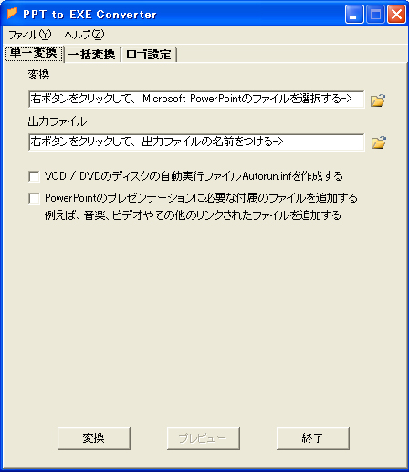 変換したEXEファイルは任意のコンピュータにコピーすることもできますし、VCD/DVDにコピーすることもできます、PowerPointや別のプログラムを実行する必要が全然ありません、変換したEXEファイルを実行して、PowerPoint 97 およびそれ以降のバージョンで作成されたプレゼンテーションを忠実に表示することができますし、その上、プレゼンテーションの前後は好きなロゴ画像が追加することも出来ます。