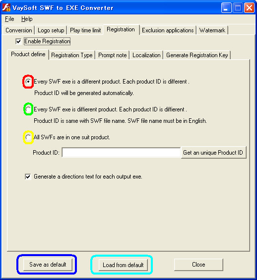 When you convert a SWF file to exe with registration enabled, the output exe has a product id. if the output exes product id are same, it means the output exe is in a suit. if your uses input any one correct registration key, the others will not need input registration key again.