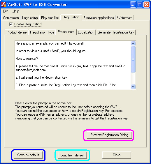 Secondly, you can check off 'Enable time limit' in Play time limit tab, check on '"Enable Registration' in Registration tab and then convert. The output exe is full version SWFo exe. After he input correct registration key, he can play the SWF in certation computer.