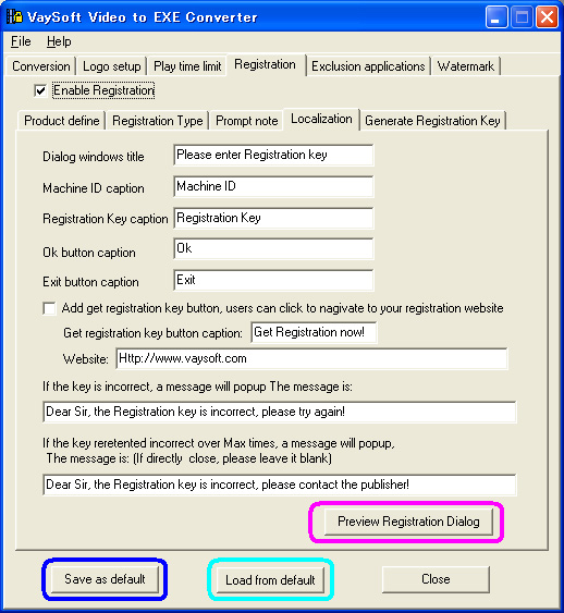 3) Select “Localization” bar, edit the items of the registration dialog. 5. Select the “conversion” bar, click the button “convert”, after the conversion, you can click the button “preview” to preview the converted EXE file.