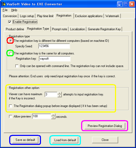 Secondly, you can check off 'Enable time limit' in Play time limit tab, check on '"Enable Registration' in Registration tab and then convert. The output exe is full version video exe. After he input correct registration key, he can play the video in certation computer.
